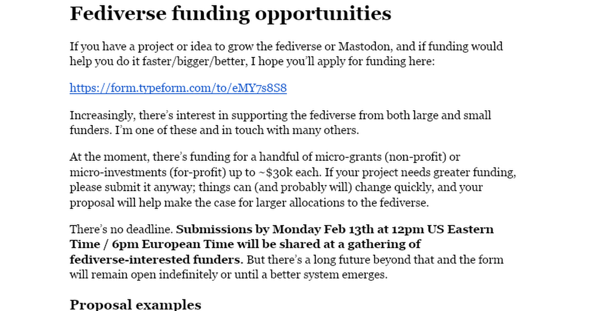 If you have a project or idea (for- or non-profit) that helps build or grow the fediverse and would benefit from funding, I hope you'll apply here. Thank you!